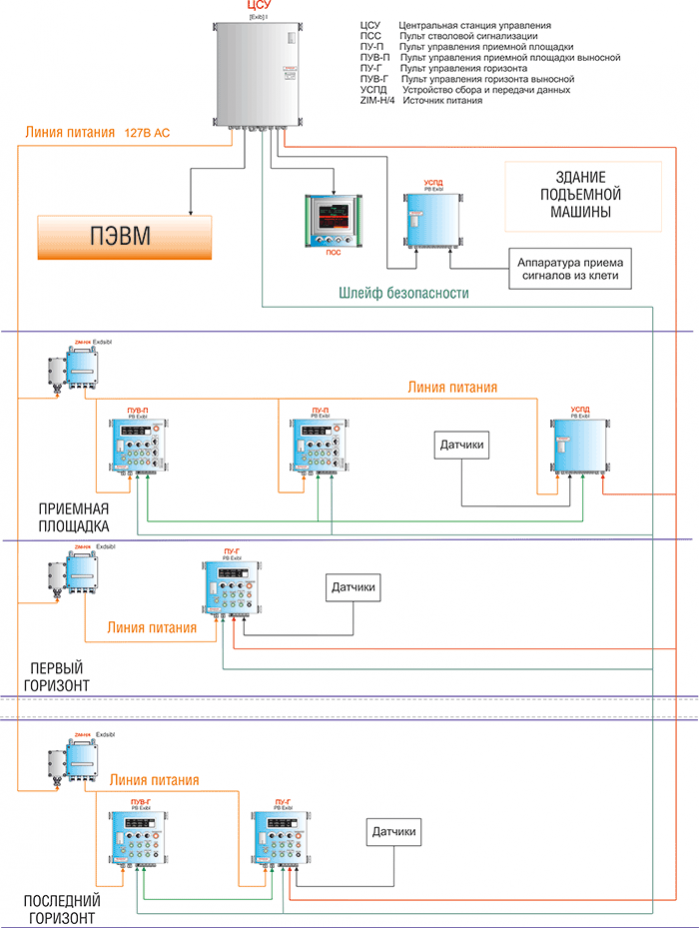 - Повышенная электрическая безопасность системы за счет низкого напряжения питания стабилизированных источников питания ~ 127 В и питанием всех шкафов на приёмной площадке и горизонтах стабилизированным искробезопасным напряжением 12В DC.